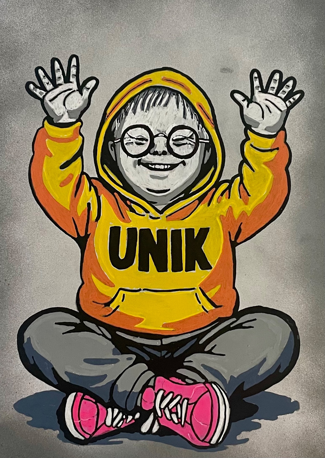 "UNIK" er min hyllest til gleden vi alle bærer på – den som bobler over når vi tør å være oss selv. Motivet viser et barn i hettegenser med ordet UNIK, hendene i været og et smil som fyller hele rommet. De rosa skoene og den gule/oransje genseren bryter gjennom den grå, urbane bakgrunnen og gjør motivet lett å elske – både på avstand og tett på.