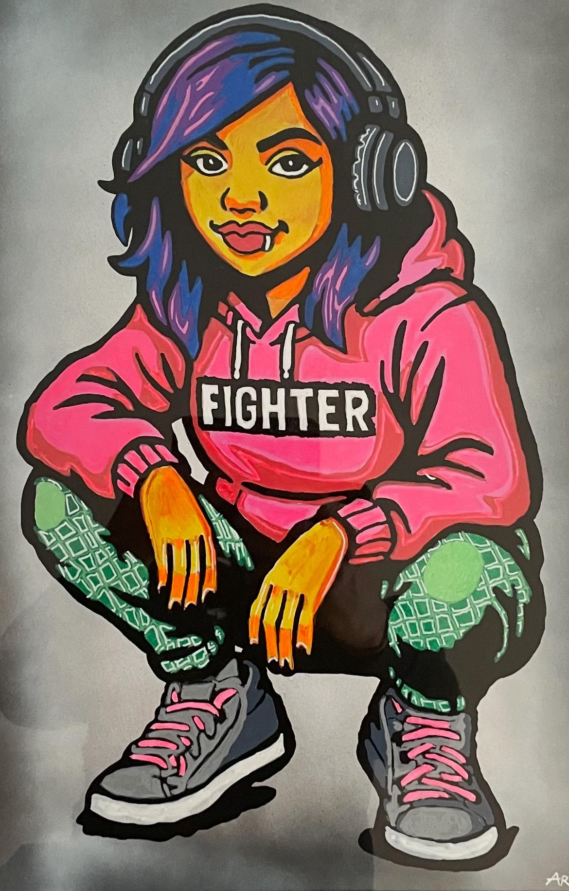 Motivet viser en jente med lilla hår, rosa hettegenser og hodetelefoner – et sterkt og moderne symbol på mot, uavhengighet og vilje til å stå i det.