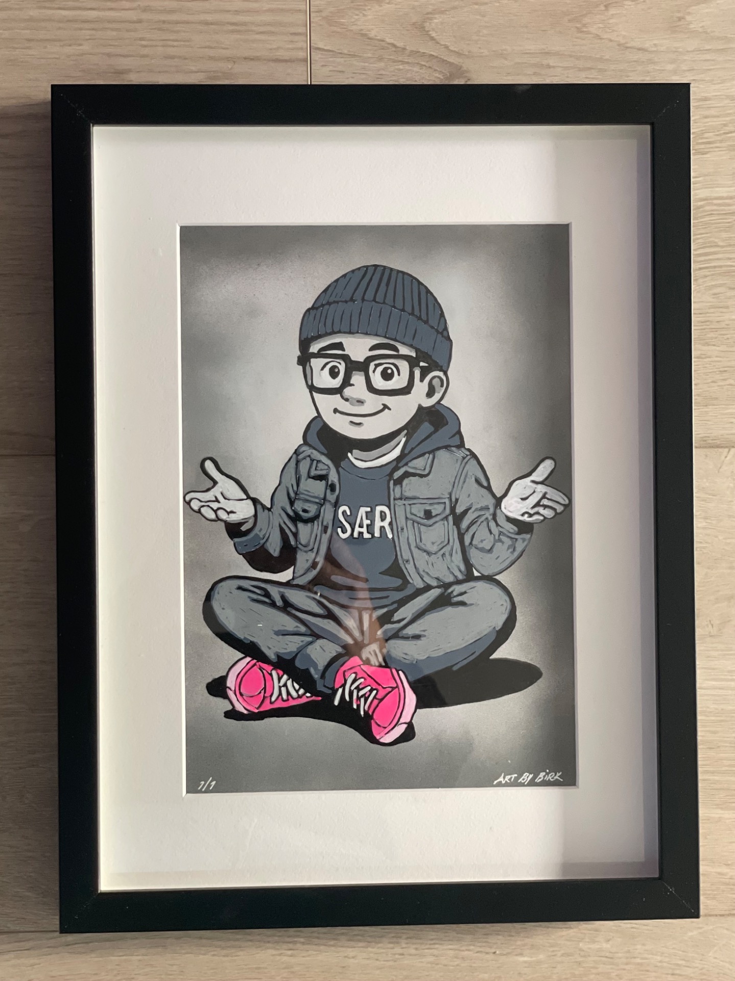 Et lekent og karakterfullt kunstverk fra Art by Birk. Figuren sitter avslappet med hendene ut, iført jeansjakke, lue og knallrosa sneakers – med ordet "SÆR" som statement på genseren. En hyllest til å være annerledes og stå støtt i egen stil.