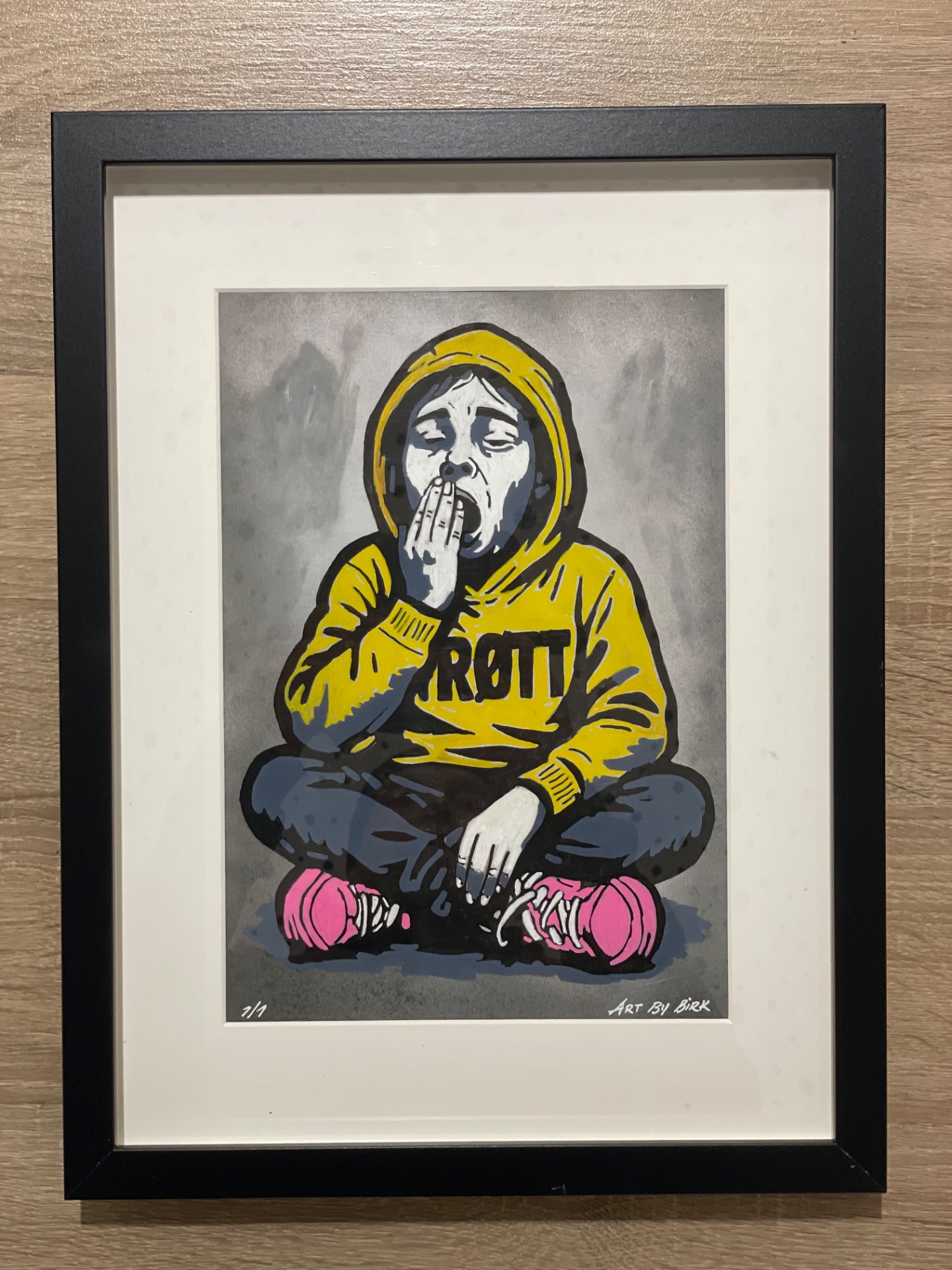 Motivet viser en sittende figur i gul hettegenser med teksten TRØTT, midt i et gjesp – ærlig, menneskelig og fullt av personlighet. De rosa skoene tilfører en frisk kontrast til den dempede paletten.
